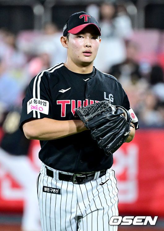 [OSEN=수원, 최규한 기자] 16일 수원 KT위즈파크에서 ‘2025 신한 SOL Bank KBO리그’ KT 위즈와 LG 트윈스의 경기가 열렸다. 홈팀 KT는 헤이수스, 방문팀 LG는 손주영을 선발로 내세웠다. 4회말 KT 공격을 삼자범퇴로 막아낸 LG 김영우가 더그아웃으로 향하고 있다. 2025.09.16 / dreamer@osen.co.kr