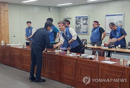 (부산=연합뉴스) 16일 오후 부산 금정구 노포차량기지 홍보장에서 부산지하철 노사가 임금을 포함한 단체협상 잠정 합의안에 합의한 뒤 악수하고 있다. 노조는 17일 오전 첫차부터 시작하려던 파업을 철회했다. 2025.9.16 [부산교통공사 제공. 재판매 및 DB 금지]