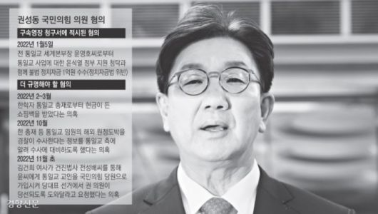 권 의원은 2022년 1월5일 통일교 전 세계본부장 윤영호씨로부터 통일교 행사 청탁과 윤석열 당시 국민의힘 대선 후보 지원 명목으로 현금 1억원의 정치자금을 받은 혐의를 받는다. 특검은 이 돈이 ‘통일교가 주최하는 한반도 평화서밋 행사에 윤 후보가 참석하도록 도와달라’, ‘윤 후보가 당선되면 통일교 정책을 국가정책으로 추진하고, 정부 예산 등을 통해 통일교의 대규모 프로젝트와 행사를 도와달라’ 등 통일교가 권 의원에 전한 청탁의 대가로 의심하고 있다.