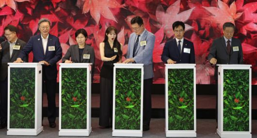 김대현(왼쪽 다섯 번째) 문화체육관광부 제2차관과 가수 츄(네 번째) 등이 16일 서울 중구 한국관광공사 서울센터에서 열린 지방 살리기 범국민 여행 캠페인 ‘여행가는 가을’ 선포식에서 세리머니를 하고 있다. 문화체육관광부 제공 |