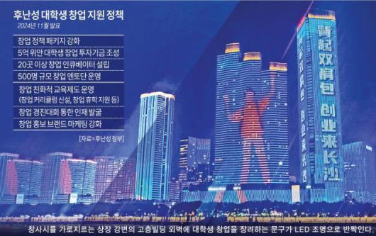 어둠이 내리면 창사 시내를 가로지르는 샹장 강변에 빽빽하게 밀집한 빌딩 조명에는 “배낭을 메고 창사에 창업하러 오세요(背起雙肩包,創業來長沙)”라는 문구가 반짝인다. 창사시 도로를 오가는 푸른색 택시 위 광고판에서도 “후난에 와서 창업하세요(來湖南,創業吧)!" 라는 글귀를 쉽게 찾아볼 수 있다. 모두 창사시가 대학생 창업 지원을 위해 내놓은 캐치프레이즈다.