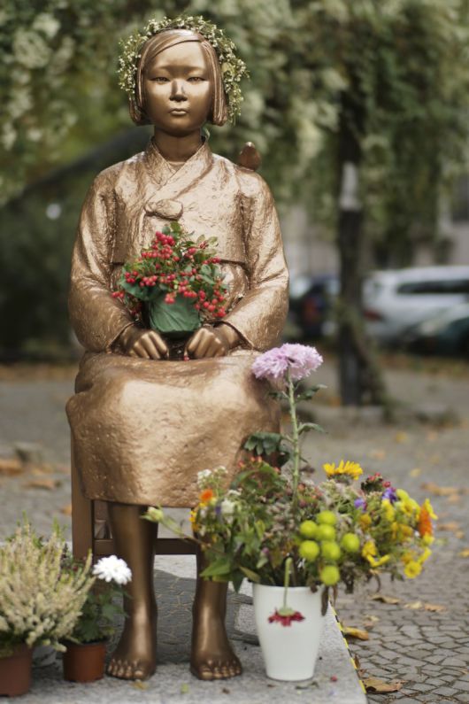 2020년 10월 9일 독일 베를린 미테구에 설치된 일본군 위안부 상징 '평화의 소녀상'에 꽃 장식이 놓여져 있는 모습. 뉴시스 |