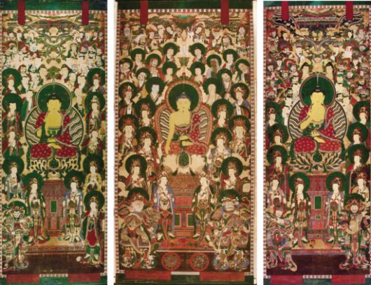영조 20년(1744) 제작돼 직지사 대웅전에 봉안된 석가여래삼불회도는 조선 후기 불화의 정수를 보여준다. 현존 삼불회도 중 가장 오래되고 규모가 크다. 중앙 영산회상도, 좌측 약사여래설법도, 우측 아미타여래설법도 등 세 폭도 온전하게 남아 있다. 장대한 화면에 수십 명의 인물을 섬세하고 유려하게 그려 넣어 장중함을 자아낸다.