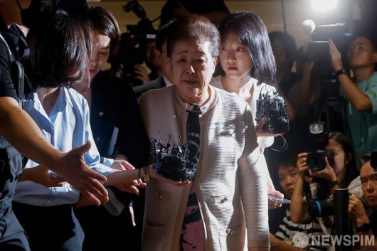 [서울=뉴스핌] 류기찬 기자 = 권성동 국민의힘 의원에게 정치자금을 제공한 혐의를 받는 한학자 통일교 총재가 17일 오전 서울 종로구 KT광화문빌딩 웨스트에 마련된 김건희 특검 사무실로 출석하고 있다. 2025.09.17 ryuchan0925@newspim.com