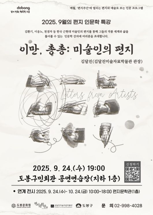 [백현석 기자] (문화뉴스 백현석 기자) 도봉문화원 편지문학관이 9월 24일 수요일 오후 7시, 도봉구민회관 공연연습장에서 2025. 편지 인문학 특강 <이만, 총총: 미술인의 편지>를 개최한다.
