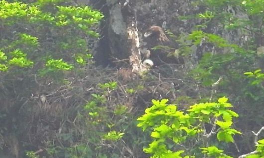 멸종위기 야생생물 1급이자 대형 맹금류인 검독수리의 번식 둥지가 제주 한라산에서 확인됐다. 사진은 검독수리 둥지 내 암컷 성조와 유조. 국립생태원 제공 |