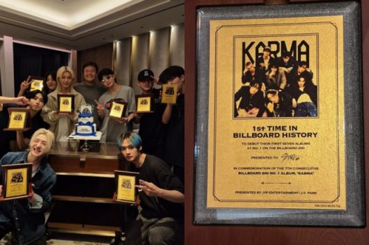 액자에는 스트레이 키즈가 새 정규앨범 ‘카르마’(KARMA)로 미국 빌보드 메인 앨범차트 ‘빌보드 200’에서 팀 통산 7번째 정상을 차지한 것을 기념하는 내용이 담겼다.