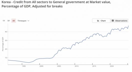 우리나라 GDP 대비 정부부채 비율은 추세적 상승 흐름을 보이고 있다. 2012년 2분기(30.5%) 처음으로 30%선을 넘었고, 2020년 1분기 40.3%를 기록하며 처음 40%대로 올라섰다.