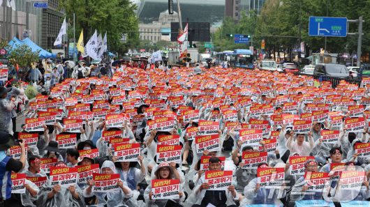 (서울=뉴스1) 황기선 기자 = 공공운수노조 의료연대본부 조합원들이 17일 오후 서울 세종대로 숭례문앞에서 열린 '공동파업 대회'에서 구호를 외치고 있다. 2025.9.17/뉴스1