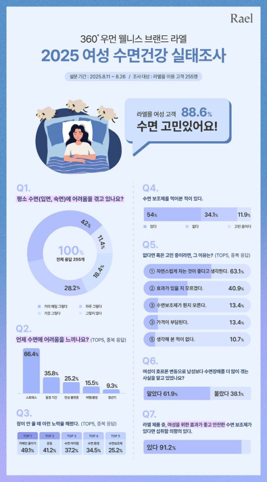 라엘은 17일 이 같은 내용이 담긴 '여성 수면건강 실태 결과'를 발표했다. 라엘은 여성 고객 255명을 대상으로 이번 조사를 실시했다.