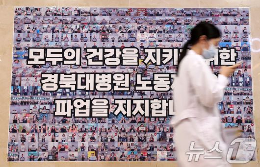 경북대학교병원 노조가 서울대·강원대·충북대병원 노조와 함께 공동 파업에 돌입한 17일 대구 중구 경북대병원 복도에 붙은 파업 지지 안내문 앞으로 의료진이 지나고 있다. 2025.9.17/뉴스1 ⓒ News1 공정식 기자 |
