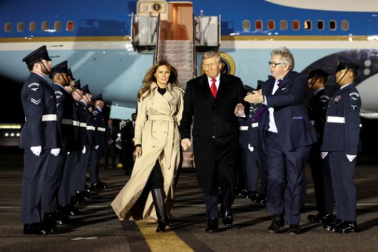 도널드 트럼프 미국 대통령과 멜라니아 여사가 16일(현지시간) 영국 런던 인근 스탠스테드 공항에 도착했다. 트럼프 대통령의 영국 국빈방문은 2번째다. 로이터=연합뉴스