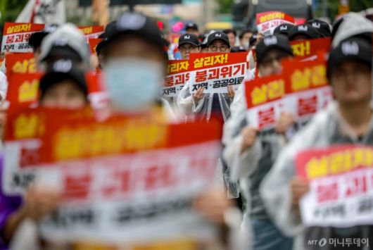[서울=뉴시스] 정병혁 기자 = 17일 서울 중구 세종대로에서 열린 공공운수노조 의료연대본부 공동파업대회에서 참석자들이 피켓을 들고 있다. 2025.09.17. jhope@newsis.com /사진=정병혁 |