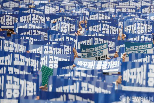 [서울=뉴스핌] 류기찬 기자 = 공공운수노조가 17일 오후 서울 중구 세종대로 일대에서 “기회는 열렸다! 바꾸자 공공기관” 917 공공기관 노동자 총파업·총력투쟁대회를 열고 구호를 외치고 있다. 2025.09.17 ryuchan0925@newspim.com