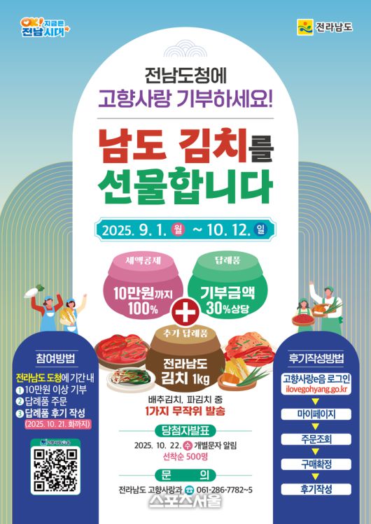 전남도청에 10만 원 이상 기부하고 답례품 후기를 작성한 선착순 500명에게 기존 답례품 외에 시니어클럽 어르신들이 직접 담근 배추김치와 파김치 중 1가지 품목(1kg)을 추가 답례품으로 제공한다.