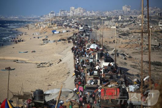 (누세이라트 AFP=뉴스1) 김경민 기자 = 이스라엘이 가자지구에 대피 명령을 내리자 팔레스타인인들이 16일(현지시간) 가자지구 중부 누세이라트 난민 캠프 지역의 도로를 따라 남쪽으로 피난을 가고 있다. 2025.9.16 ⓒ AFP=뉴스1 Copyright ⓒ 뉴스1. All rights reserved. 무단 전재 및 재배포, AI학습 이용 금지.