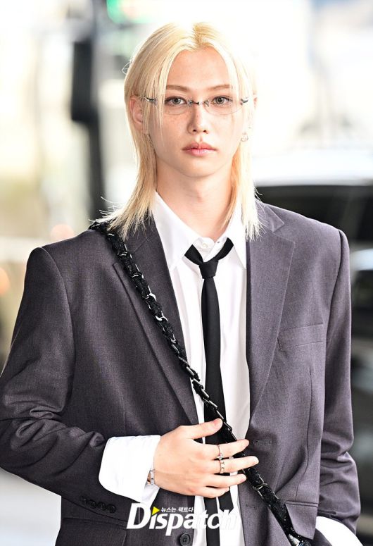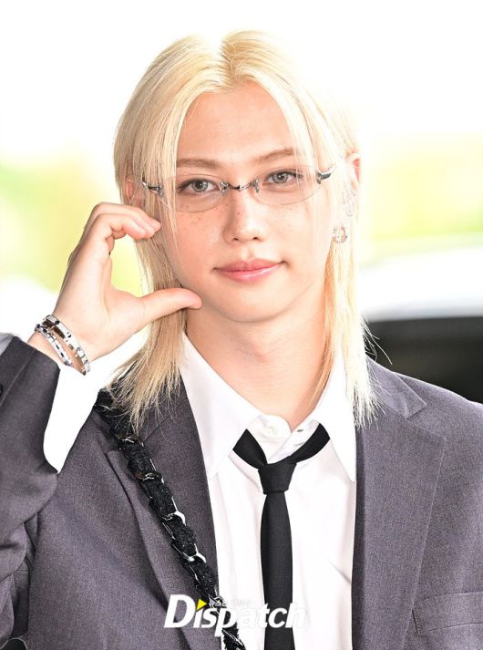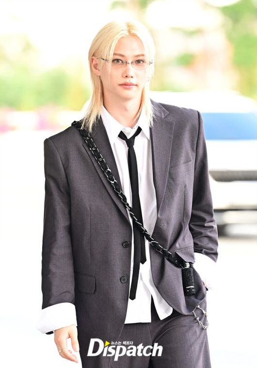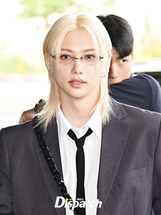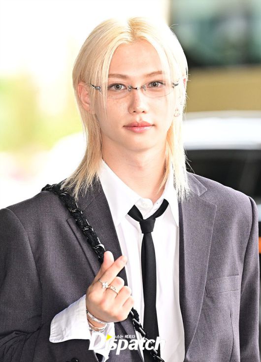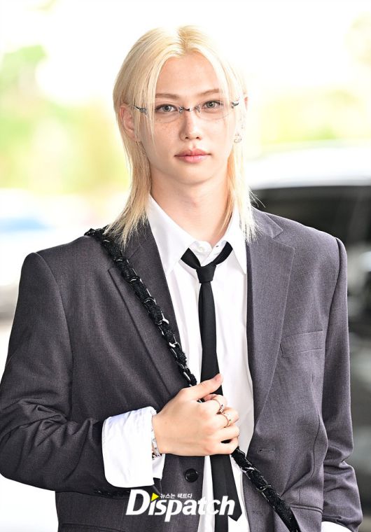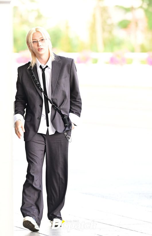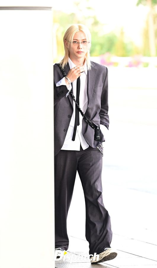 필릭스는 그레이 컬러의 수트룩으로 댄디한 공항패션을 완성했다. 눈부신 금발헤어와 조각같은 이목구비도 돋보였다.