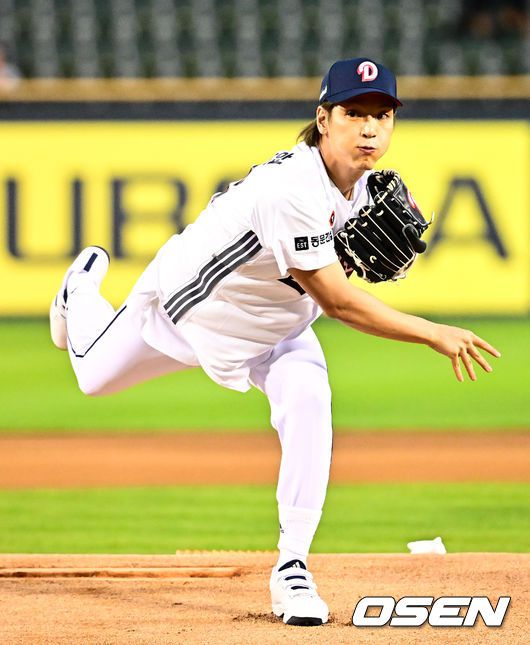 [OSEN=잠실, 지형준 기자] 17일 오후 서울 잠실구장에서 ‘2025 신한 SOL Bank KBO리그’ 두산 베어스와 키움 히어로즈의 경기가 열렸다. 두산은 콜어빈, 키움은 매르세데스가 선발로 나섰다. 가수 엔플라잉 김재현이 시구를 하고 있다. 2025.09.17 /jpnews@osen.co.kr