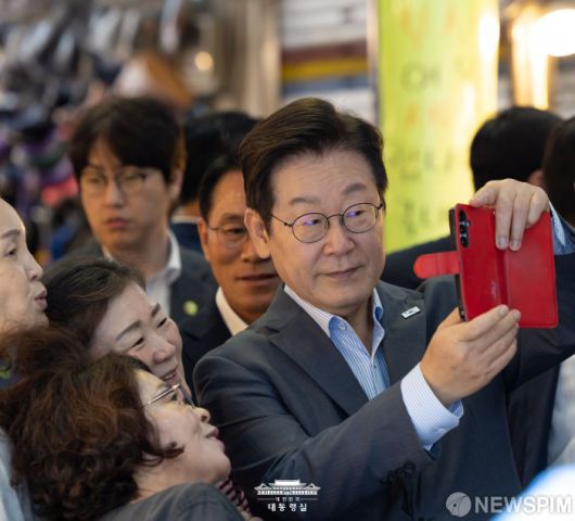 [서울=뉴스핌] 이재명 대통령이 17일 성남시 태평동 현대시장을 방문해 시민들과 기념촬영을 하고 있다. [사진=대통령실] 2025.09.17 photo@newspim.com