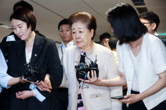 한학자 통일교 총재(가운데)가 17일 서울 종로구 KT광화문빌딩에 있는 민중기 특별검사팀 사무실에 출석하고 있다. 연합뉴스 |