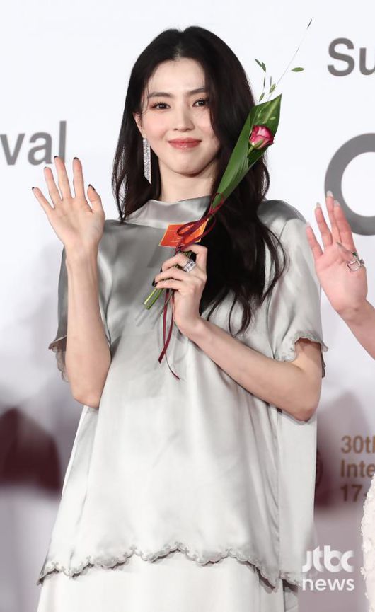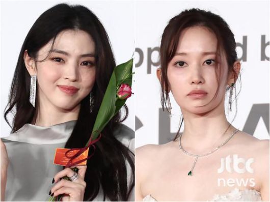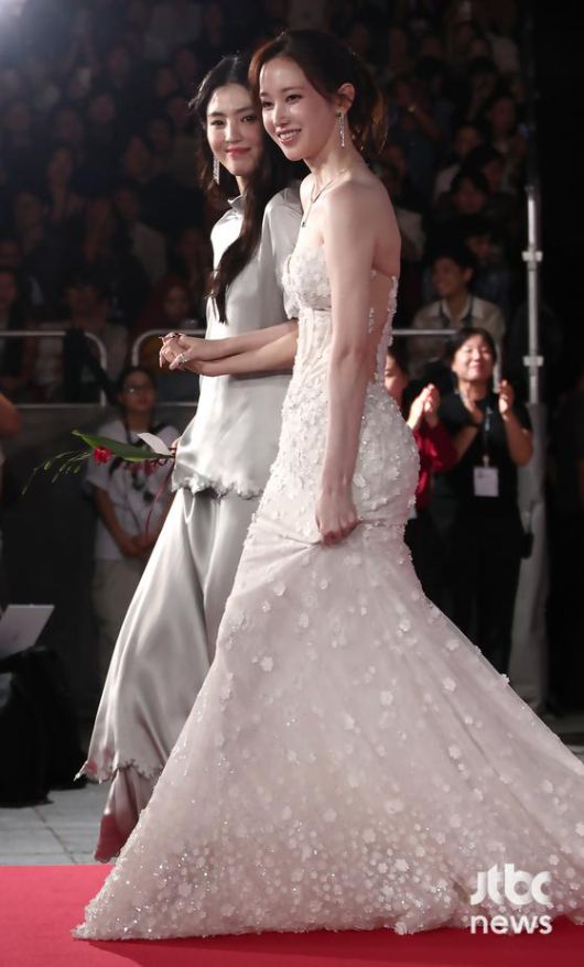 한소희는 은은한 광택이 감도는 실크 드레스를 선택해 차분하면서도 독보적인 분위기를 자아냈다. 붉은 장미 한 송이로 포인트를 더했다. 전종서는 몸매 라인을 강조한 오프 숄더 드레스를 선택, 섹시하면서 고혹적인 자태를 선보였다.