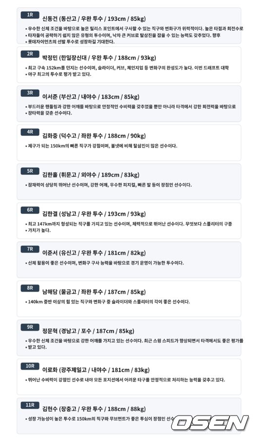 김풍철 롯데 스카우트팀장은 “투수는 즉시 전력감 선발, 불펜 투수를 지명하고자 했다. 특히 불펜 투수의 다양성 확보에 초점을 맞추었다. 야수는 장타력을 보유한 선수 위주로 확인했다”고 덧붙이며 이번 드래프트를 설명했다.
