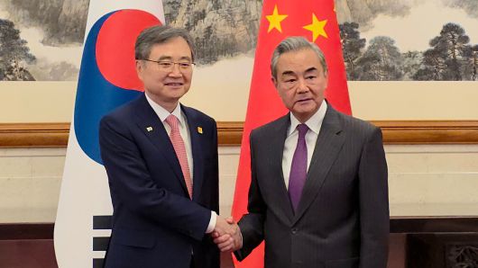 ▲ 17일 오후 중국 베이징 댜오위타이국빈관에서 조현 외교장관과 왕이 중국 외교부장이 만나 악수를 하며 기념촬영하고 있다.