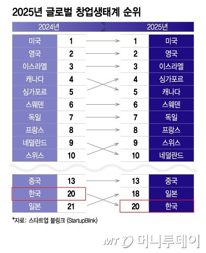 17일 글로벌 스타트업 시장조사기관 스타트업 블링크가 발표한 '스타트업 에코시스템 리포트 2025'에 따르면 올해 4월 기준 한국 스타트업 생태계 순위는 지난해 이어 20위를 유지했다. 1위 미국, 2위 영국, 3위 이스라엘 순이었고, 아시아에서는 싱가포르(4위), 중국(13위), 일본(18위)에 이어 네 번째를 기록했다. 일본은 지난해 21위로 한국보다 낮은 순위를 기록했지만 올해는 3계단 상승해 한국을 추월했다.