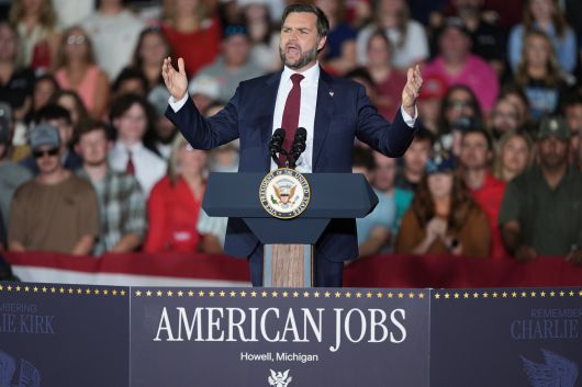 J D 밴스 미국 부통령이 17일 미시간주 호웰의 한 생산 시설을 찾아 연설을 하고 있다. /AP 연합뉴스