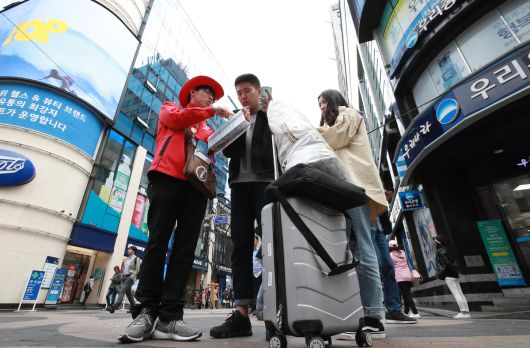 서울 명동 거리에서 중국인 관광객들이 관광 안내를 받고 있다. 연합뉴스 |