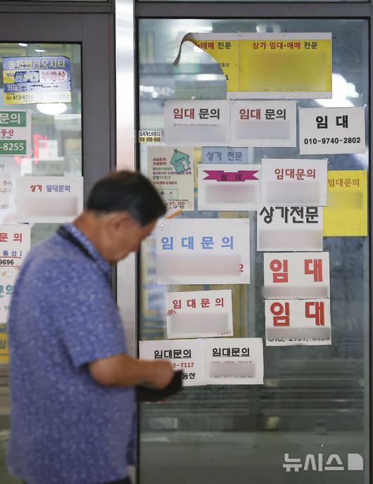 [서울=뉴시스] 김근수 기자 = 6일 서울 송파구의 한 종합상가 점포 앞에 임대 안내문이 붙어 있다. 6일 국세청 국세 통계에 따르면 지난해 개인·법인을 포함해 폐업 신고한 사업자는 100만8282명이다. 전년보다 2만1795명 증가했다. 전년보다 2만1795명 증가했다. 폐업자는 2019년 92만2159명에서 3년 연속 감소해 2022년 86만7292명까지 줄었다. 2025.07.06. |