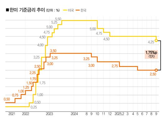 미 연준이 기준금리를 인하한 것은 지난해 12월 이후 9개월 만이다. 도널드 트럼프 대통령이 취임한 이후 첫번째 기준금리 인하다. 미 연준의 금리인하로 한국(2.50%)과 미국의 금리차는 상단 기준 1.75%포인트로 좁아졌다.
