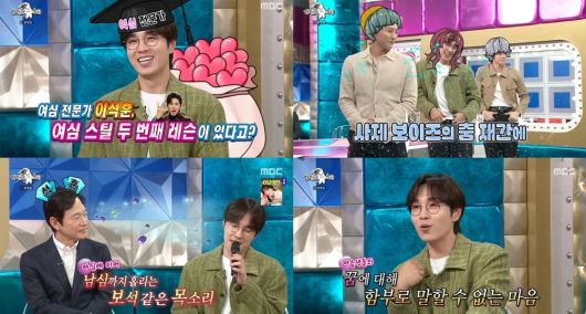 이석훈은 “요즘 ‘라스’는 춤을 춰야만 나오는 프로그램”이라며 너스레를 떨었고 실제로 옹성우, 우즈와 즉석 합동 댄스를 선보여 사제지간 의리를 과시했다. 오디션 프로그램 ‘프로듀스 101’에서 보컬 트레이너이자 멘토로 활약하던 시절을 회상하며 태도와 예의를 강조하던 일화를 소환했고, 옹성우가 직접 “예의 있게 얘기해”라는 레전드 멘트를 재현해 폭소를 자아냈다.
