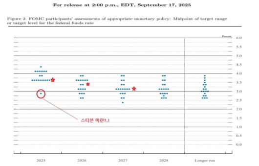흥미롭게도 올 연말 정책금리가 직전 정책금리 목표(4.25~4.5%)보다 150bp 낮은 2.75~3.0%에 위치해 있을 것이라고 예상한 '점'도 하나 있었는데, 도널드 트럼프 대통령의 특명을 받고 이번 회의에 참석한 스티븐 미란 신임 이사가 찍은 '점'으로 추정된다.