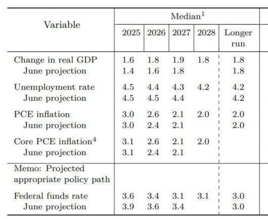 흥미로운 점은 이 같이 견조한 경제성장률 전망과 달리 통화정책 전망은 이전보다 더 완화됐다는 사실이다. 9월 점도표에 따르면 연준 위원들의 금리 전망치 중앙값은 3.625%로 지난 6월의 3.875%보다 0.25%포인트 낮아졌다.