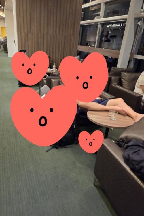 사진을 보면 남성으로 추정되는 여행객이 공항 라운지에서 신발과 양말을 모두 벗은 채 테이블 위에 발을 올리고 앉아있다.