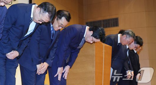 (서울=뉴스1) 박지혜 기자 = 조좌진 롯데카드 대표이사(왼쪽 세 번째)가 18일 서울 중구 부영태평빌딩 컨벤션홀에서 열린 언론 브리핑에서 롯데카드 대규모 해킹 사고 관련 대국민 사과를 하고 있다. 2025.9.18/뉴스1pjh2580@news1.krCopyright ⓒ 뉴스1. All rights reserved. 무단 전재 및 재배포, AI학습 이용 금지.