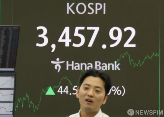 [서울=뉴스핌] 양윤모 기자 = 미국 연방준비제도(Fed)가 기준금리를 0.25%포인트 인하한 18일 오후 코스피가 전장 종가보다 44.52 포인트(1.30%) 상승하며 3457.92로, 코스닥은 11.43 포인트(1.35%) 상승한 856.96으로 거래되고 있는 가운데, 서울 중구 하나은행 딜링룸에서 직원들이 업무를 보고 있다. 서울외환시장에서 원·달러 환율은 전장 대비 5.80원 상승한 1385.90원에 거래되고 있다. 2025.09.18 yym58@newspim.com