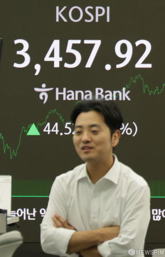[서울=뉴스핌] 양윤모 기자 = 미국 연방준비제도(Fed)가 기준금리를 0.25%포인트 인하한 18일 오후 코스피가 전장 종가보다 44.52 포인트(1.30%) 상승하며 3457.92로, 코스닥은 11.43 포인트(1.35%) 상승한 856.96으로 거래되고 있는 가운데, 서울 중구 하나은행 딜링룸에서 직원들이 업무를 보고 있다. 서울외환시장에서 원·달러 환율은 전장 대비 5.80원 상승한 1385.90원에 거래되고 있다. 2025.09.18 yym58@newspim.com
