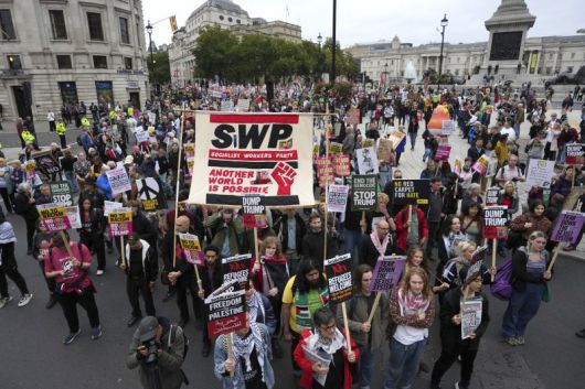 50개 이상의 노동조합과 시민단체 등으로 구성된 이른바 '스톱 트럼프 연맹(Stop Trump Coalition)' 시위대는 "트럼프를 환영하지 않는다", "인종차별 반대", "이스라엘 무장 중단" 등의 구호가 적힌 팻말을 들고 런던 중심부 포틀랜드 플레이스에서 국회의사당 인근 광장을 향해 행진했다.