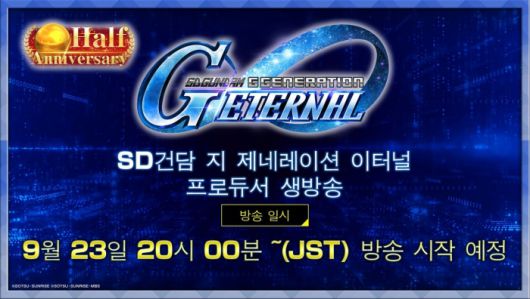 이 밖에도 곧 하프 애니버서리를 맞이하는 『SD건담 지 제네레이션 이터널』 운영팀에서는 9월 23일 코지마 쇼고 프로듀서가 출연하는 “프로듀서 생방송”도 진행 예정이다.