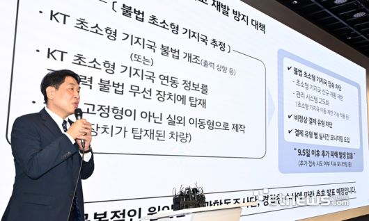 KT 소액결제 피해 관련 기자 브리핑이 18일 서울 종로구 KT 광화문 West 사옥에서 열렸다. 구재형 네트워크부문 네트워크기술본부장이 불법 초소형 기지국 사고 재발 방지대책을 발표하고 있다. 이동근기자 foto@etnews.com |