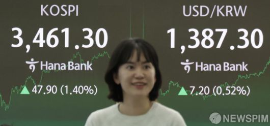 [서울=뉴스핌] 양윤모 기자 = 미국 연방준비제도(Fed)가 기준금리를 0.25%포인트 인하한 18일 오후 코스피가 전장 종가보다 47.90 포인트(1.40%) 상승하며 3461.30으로, 코스닥은 11.58 포인트(1.37%) 상승한 857.11로 장을 마감한 가운데, 서울 중구 하나은행 딜링룸에서 직원들이 업무를 보고 있다. 서울외환시장에서 원·달러 환율은 전장 대비 7.20원 상승한 1387.30원에 거래를 마감했다. 2025.09.18 yym58@newspim.com