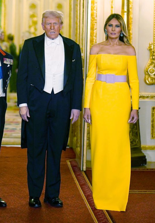 같은날 저녁 윈저성에서 열린 만찬에서 멜라니아 여사는 어깨를 드러내는 선명한 노란색 드레스를 선택했다. 미국 브랜드인 캐롤리나 헤레라의 제품으로, 허리에는 연보라색 실크 벨트를 착용했다. 귀에는 녹색 다이아몬드가 들어간 귀고리를 걸쳤다. 콰이는 드레스에 대해 “국빈 만찬에서 볼 만한 색상이 아니었다”며 “국가 외교 의례에 맞는지는 몰라도 어깨를 드러내는 드레스는 다소 과감했다”고 평했다. 프리드먼은 “‘미국의 황금 시대는 이제 시작된다’고 천명한 트럼프 대통의 메시지를 반영한 의상이었다”고 해석했다.