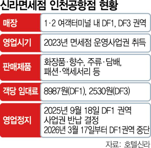 신라면세점을 운영하는 호텔신라는 18일 이사회에서 인천국제공항 제1·2여객터미널의 화장품·향수·주류·담배 구역(DF1) 사업권을 반납하기로 결정했다고 공시했다. 이 권역의 지난해 매출은 4292억 원으로 지난해 호텔신라 연결 매출(3조 9500억 원)의 10.9%에 해당된다. 호텔신라 측은 “인천공항에서 영업을 지속하기에는 손실이 너무 큰 상황”이라면서 “회사는 재무구조를 개선하고 기업 및 주주가치 제고가 필요하다는 판단하에 부득이하게 인천공항 면세점 DF1권역 사업권을 반납하기로 결정했다”고 밝혔다. 호텔신라는 이날 임대보증금에 상당하는 약 1900억원의 위약금을 공항공사 측에 입금한 것으로 전해졌다.영업정지일은 내년 3월 17일이다.