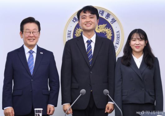 [서울=뉴시스] 최동준 기자 = 이재명 대통령이 18일 서울 용산 대통령실 청사에서 열린 수석보좌관회의에서 이주형(가운데), 최지원 청년담당관에게 임명장 수여 후 기념촬영을 하고 있다. (대통령실통신사진기자단) 2025.09.18. photocdj@newsis.com /사진= |