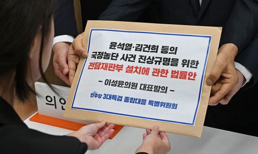 더불어민주당 3대특검 종합대응 특별위원회 이성윤 의원 등이 18일 서울 여의도 국회 의안과에 '윤석열·김건희 등의 국정농단 사건 진상규명을 위한 전담재판부 설치에 관한 법률안'을 제출하고 있다. 국회사진기자단