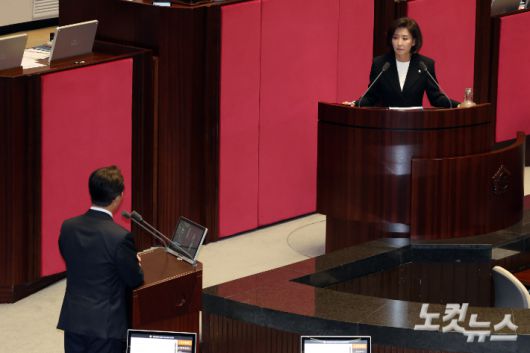 19일 서울 여의도 국회에서 열린 제429회국회(정기회) 제8차 본회의 교육·사회·문화에 관한 질문에서 국민의힘 나경원 의원이 김민석 국무총리에게 질의를 하고 있다. 윤창원 기자 |