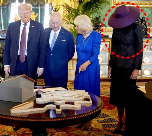 18일(현지 시간) 미국 온라인 커뮤니티 레딧 등에는 17일(현지 시간) 윈저성을 방문한 트럼프 대통령 부부의 사진 한 장이 화제가 됐다. 사진에는 영국 찰스 3세 국왕 부부가 트럼프 대통령 부부에게 윈저성 내 전시 물품을 설명하는 모습이 담겼다.