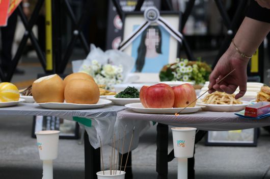 이날 심씨의 제사상은 경찰 바리케이드 앞에 차려졌다. 영정 속 고인은 앳된 얼굴이었다. ‘우리의 권리를 찾기 위해 죽음으로 싸우겠다’고 적힌 손팻말을 든 고인의 생전 사진도 놓였다. 검은 옷차림의 동료들은 수척한 얼굴로 접이식 상 위에 과일과 전, 떡, 국, 소주와 캔맥주를 올렸다. 영정 앞에 향을 피우고 절을 올린 뒤, 눈시울을 붉힌 채 멍하니 사진을 바라보다 손수건으로 눈물을 훔치기도 했다.
